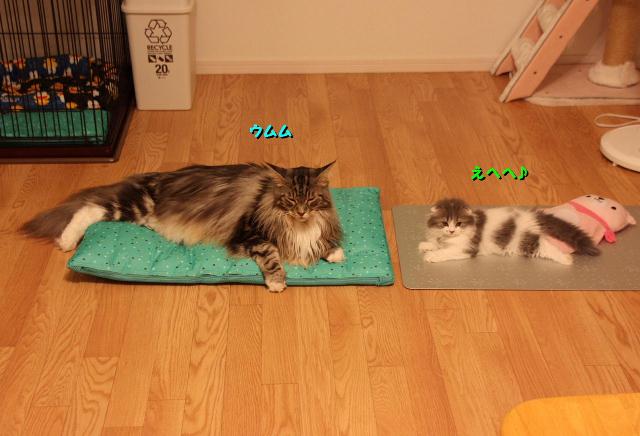 警戒しながらも冷え冷えマット命のショーンくんは動くことができず。