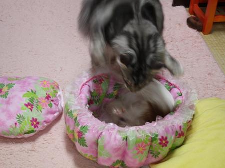 暑がりでノビノビな場所が好きなショーンは普段あまりベッドを使いません。どちらかというとベッド使用中のデュウちゃんを襲っている回数の方が多いかも?!逆にデュウちゃんはベッドをあれこれ気分や気候によって使い分けてます。ふわふわなところが好きなんですね~。いくら襲われてもめげる様子は皆無です。ご心配くださった皆様どうぞご安心くださいね。