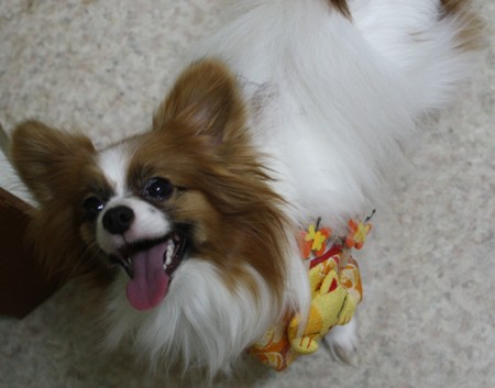 そうそう。パピヨンはお耳のところが蝶々みたいなのでパピヨンというんですよ~。正面や真後ろから見ると本当に蝶々みたいなんです。特にデュウちゃんは蝶々部分だけ茶色なので、背景が白だと一層分かりやすいです。