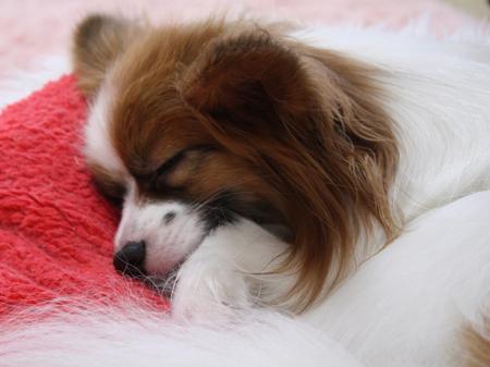デュウちゃんがお気に入りのいちごベッドでお昼寝中