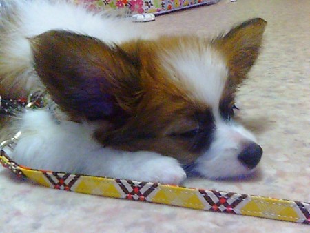 赤ちゃんのデュウちゃんいかがでしたか?パピヨンってお耳が大きいのが特徴なのに赤ちゃんの時はめちゃめちゃちっちゃい!生まれた時から大きいわけじゃないんですね。しかも2ヶ月過ぎる頃までは垂れたまんまだし。大きい耳を支えるには耳が少し硬くなるのを待たないとみたいです。ウチにきた時はまだ両耳垂れたままだったので、本当にちゃんと立つのかどうかとても不安でした。なかなか立たない場合はテープなどで立った形を記憶させないとなので、やった方がいいのかどうかと思ったりもしたくらい。結局はそのまま放っておいたらしっかり立ったのでその必要はなかったんですけどね。