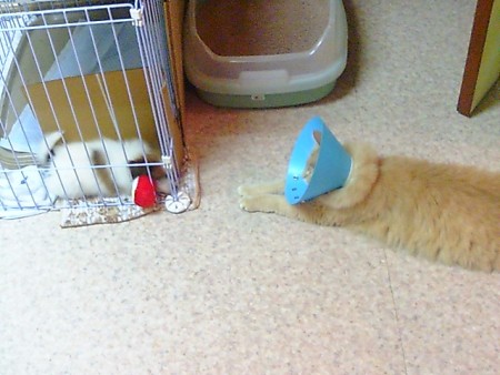 もちろん初めて見た時はビックリしてシャーシャー言ってました。でもワンコって猫みたいに高いところには来れないし、子犬の頃はケージにいる時間も長かったので、ネイチくん的にはいつでも逃げられるっていう安心感もあったみたい。ストレスで熱を出すんじゃないかと心配していましたが、それも取り越し苦労に終わってほっとしました。