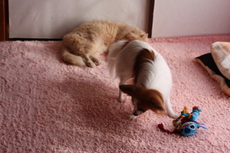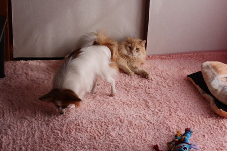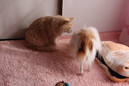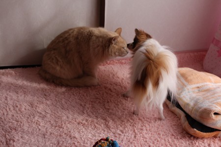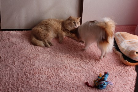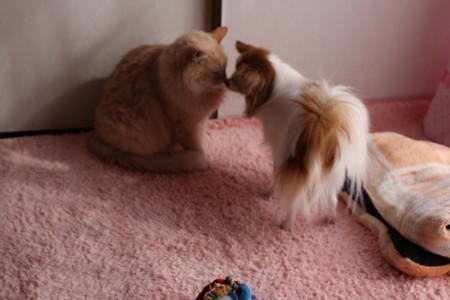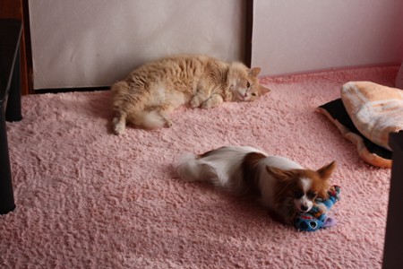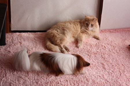 ワンコとニャンコって犬猿の仲のように言われることもあるけど、ウチでは全く同じ様に暮らしているので、本人達は同じ種類だって思っているんじゃないかな?