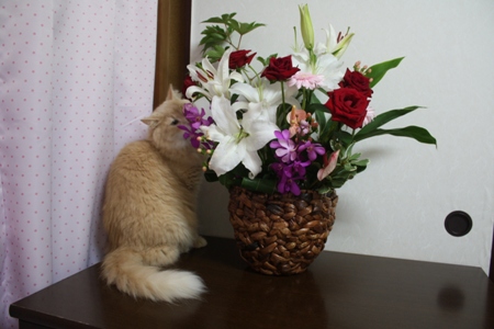 いただいたお花は猫達が興味津々なので今は手の届かないところに飾ってあります~。せっかくいただいたお花、長くもたせるように気をつけないと~。