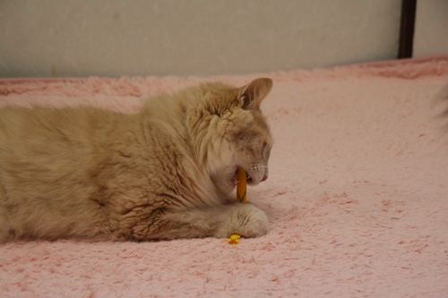 の写真でショーンの足元に転がっているキャンディはまちゃこさんお手製の編み編みキャンディ。またたびの棒が入っています。まちゃこさんは編み物がとっても上手。お花の首輪なんかも簡単に編んじゃってしかもとっても可愛いのです~
