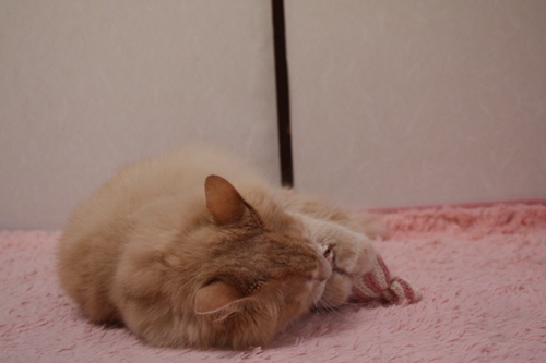 の写真でショーンの足元に転がっているキャンディはまちゃこさんお手製の編み編みキャンディ。またたびの棒が入っています。
