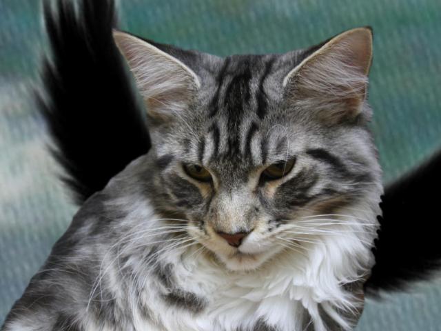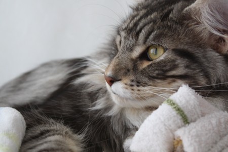 くっきりアイラインで可愛らしくもメインクーンらしいキリリとした顔立ち