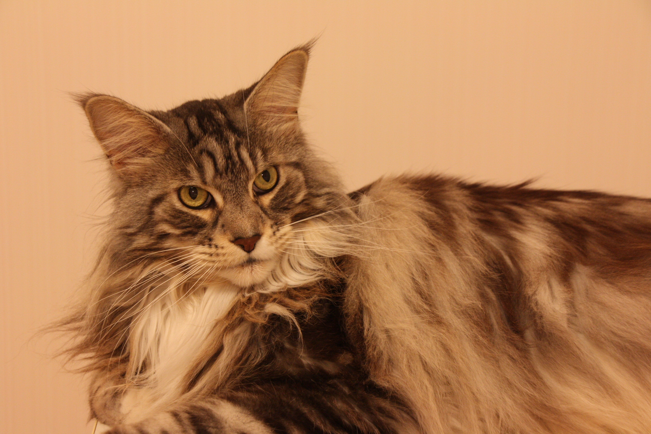 くっきりアイラインで可愛らしくもメインクーンらしいキリリとした顔立ち