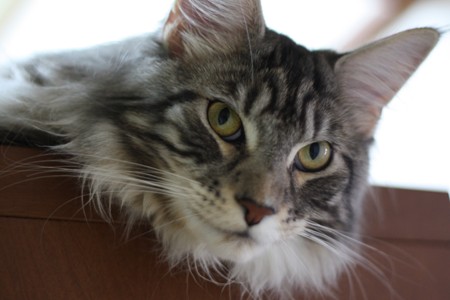 くっきりアイラインで可愛らしくもメインクーンらしいキリリとした顔立ち