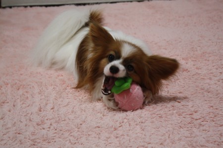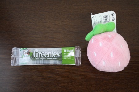 いちごのおもちゃとデンタルガムのグリニーズをくださいました