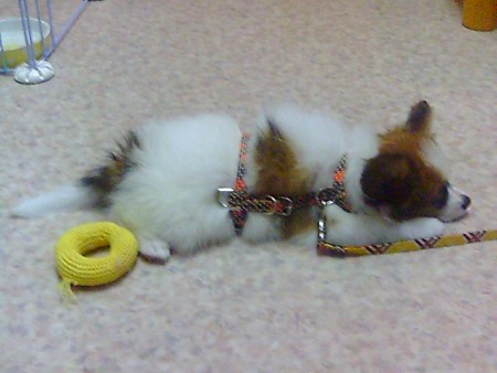 お散歩させる前に室内でハーネスに慣れさせているところです。