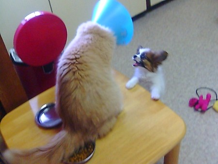 りんごのおもちゃで遊ぶデュウちゃんをガン見してます。