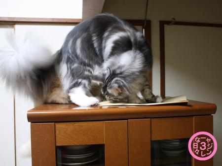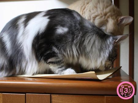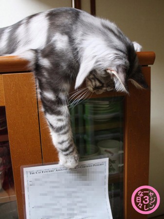とりあえず食器棚の上に置いた封筒にすぐさま飛び乗るショーン。