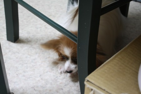 誰にもとられないように物陰でほうばるデュウちゃん。