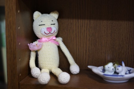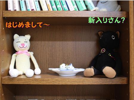 あみねこさんに万が一のことがあっては大変なので本棚のガラス戸の中で黒猫くんと我が家の3レンジャーを見守っていただくことにしましたよ。