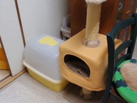 トイレ場所は棚と壁の間。