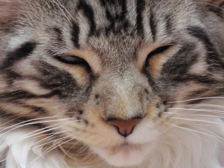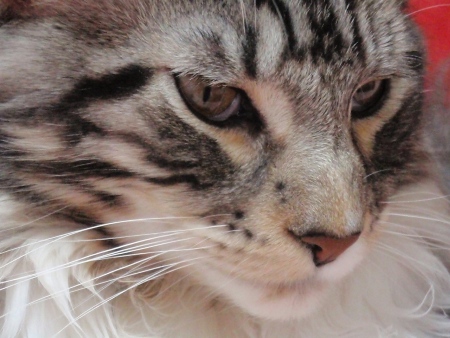 くっきりアイラインで可愛らしくもメインクーンらしいキリリとした顔立ち