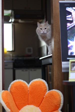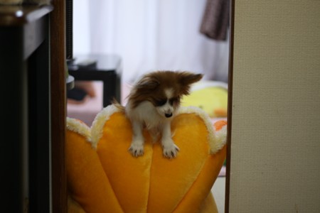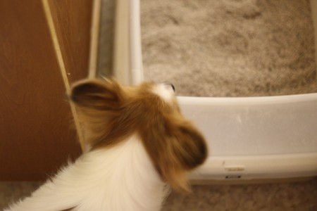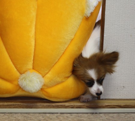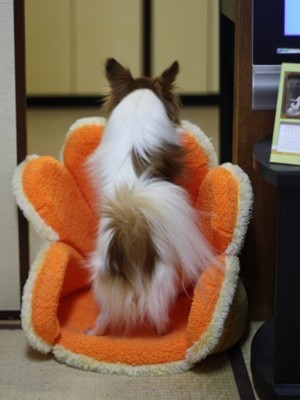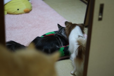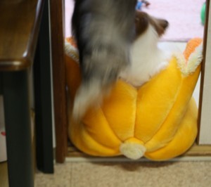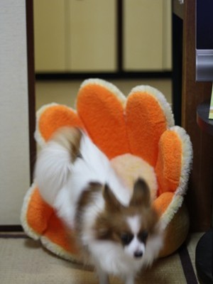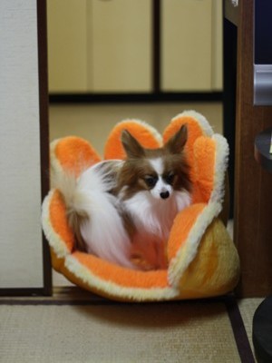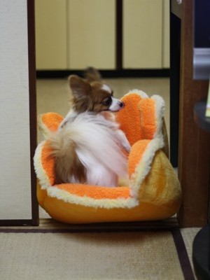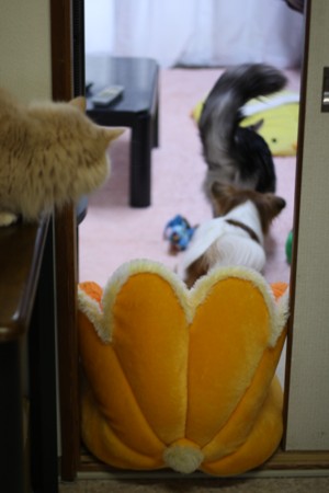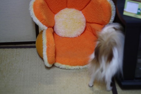 お花ベッドでデュウちゃんが猫トイレのあるお部屋へ行けないように遮断