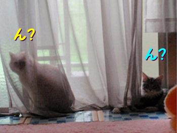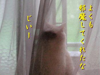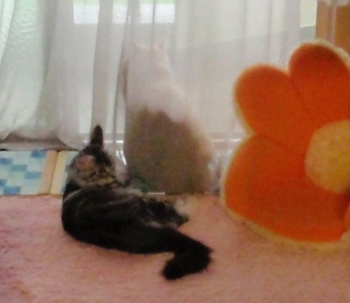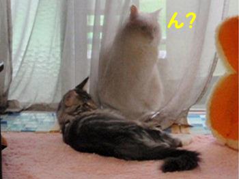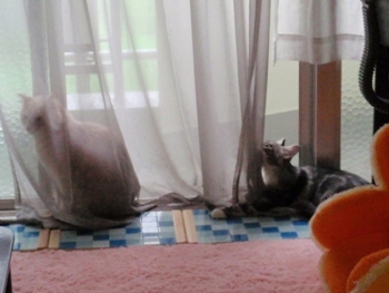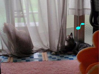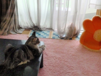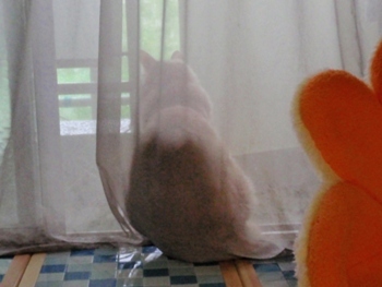 レースカーテンの向こう側でのんびりと外を眺めるネイチくん