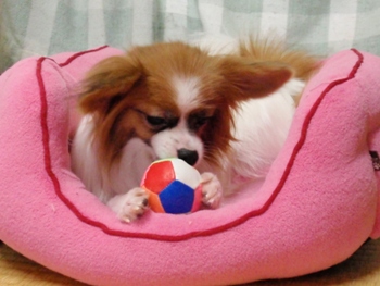 欲張っておもちゃを二つも頬張るからボールを落としちゃいました。
