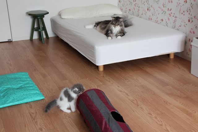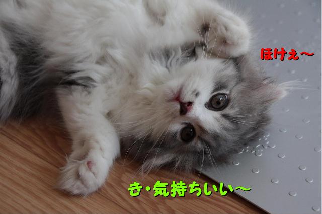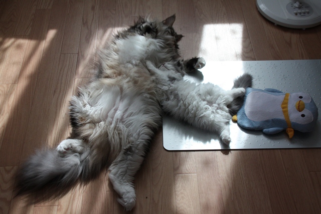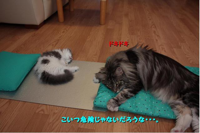 警戒しながらも冷え冷えマット命のショーンくんは動くことができず。