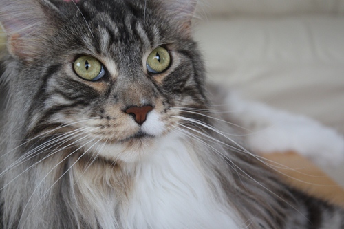 くっきりアイラインで可愛らしくもメインクーンらしいキリリとした顔立ち