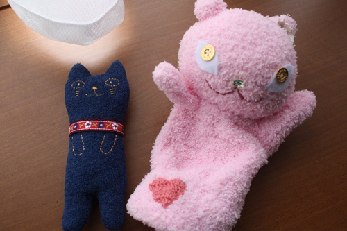 今お店のイベントで出してくださっているAugustさんの鳴きねこさんとnana*maniaさんのパペットちゃん。
