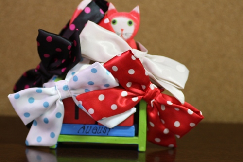 猫のりぼんといえば赤かな~って気もするけど、黒地にピンクの水玉も可愛いです。