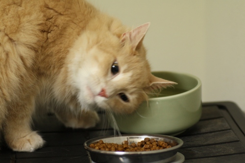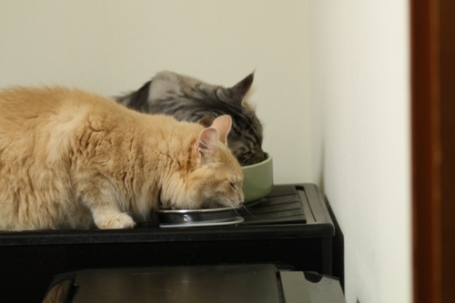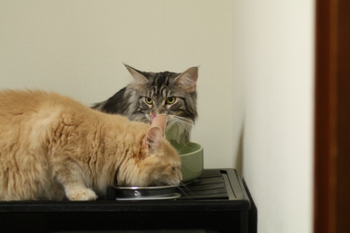 ゴハンのカリカリをむさぼるネイチくんの横でまたたび茶を飲むショーン。