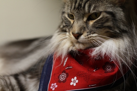 くっきりアイラインで可愛らしくもメインクーンらしいキリリとした顔立ち
