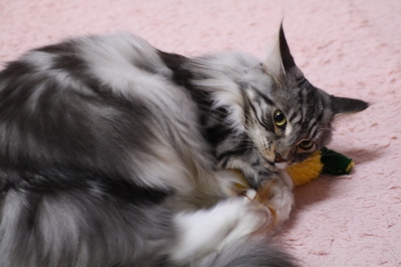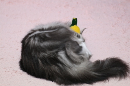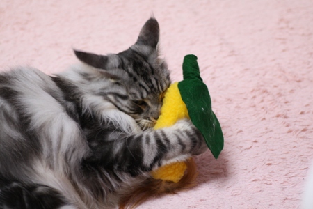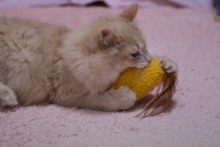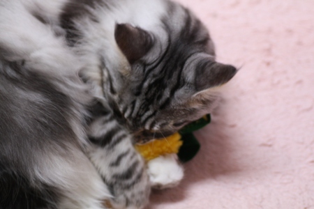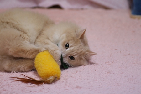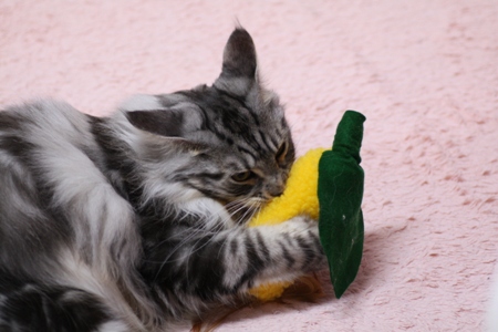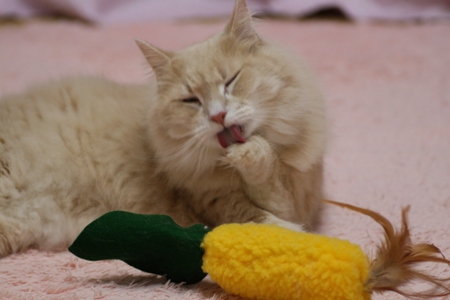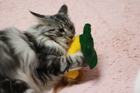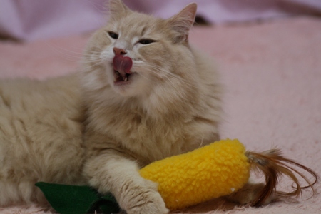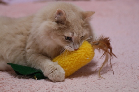 Cat’s Padさんで購入したまたたびキッカーのとうもろこしをぎゅぅ~っと抱きしめるショーンです