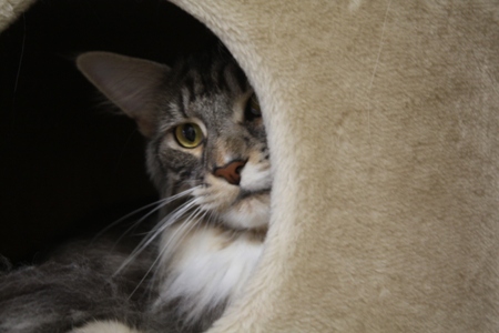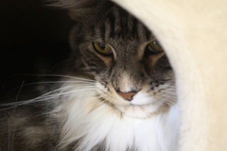 くっきりアイラインで可愛らしくもメインクーンらしいキリリとした顔立ち