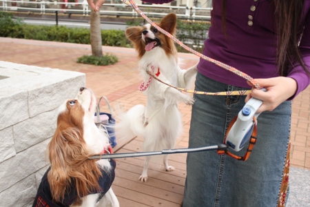 ななちゃんはちゃんといい子でお座りしてるけどデュウちゃんはたまらずタッチしております。